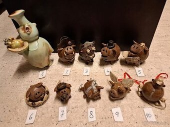 Cena: V textu. č.1. retro soška kuchtík, výška 24 cm, průměr přibližně 12 cm. Cena 900,- Kč. č.2. až č. 9. prasata: Napoleon, rocker, lord, s novinami, kuřák, lampasák, bruslař a anděl. Cena 120,-/ks. č.10. tlouštík se švihadlem, výška 9 cm. Cena 120,,- Kč.