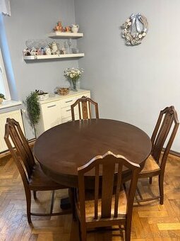 Nabízíme k prodeji starožitný rozkládací jídelní stůl včetně židlí z masivního dřeva. Tento elegantní set zaujme nadčasovým designem, krásnou kresbou dřeva a pevnou konstrukcí. Díky rozkládacímu mechanismu lze stůl snadno zvětšit, takže je ideální jak pro rodinné stolování, tak pro větší návštěvy. Nábytek nese běžné známky používání, proto bude potřeba mu věnovat trochu péče, aby znovu plně vynikl jeho přirozený půvab. U židlí doporučujeme výměnu koženého čalounění, které je již opotřebované – po renovaci však může celý set působit velmi reprezentativně. Naše představa o ceně je 10 000 Kč. V případě zájmu nás neváhejte kontaktovat do zpráv.