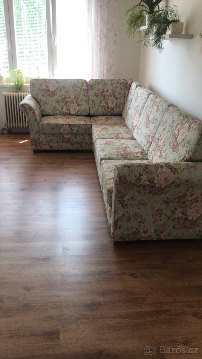 Top stav.Neprisezená-krásný Dekor potahů-velké polštáře na zip-pratelné.Sedacka i po sundani polstru má měkká záda,lze použit na dva způsoby.
