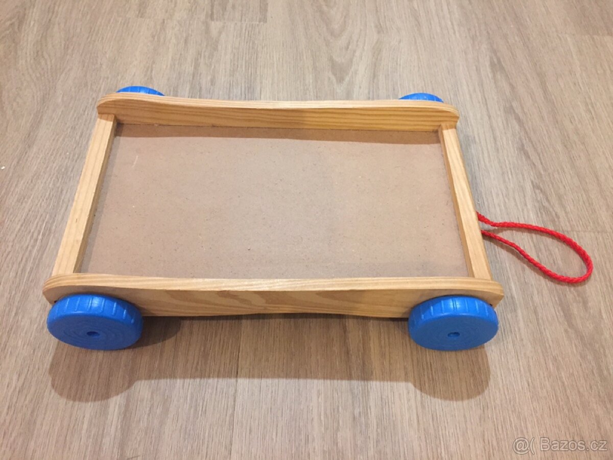 Dřevěný vozíček, rozměry 22 x 33 x 7 cm, plastová kolečka.