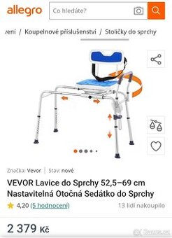 Lavice byla sestavena a vyzkoušena u vany, ale nijak nepoužita, bohužel se nevejde do prostoru koupelny. Lavice je zabalená v orig. krabici. Původní cena 2400 Kč, viz obrázky. Posuvná sedačka do vany Zajistěte si bezpečí při koupání: Vstupujte a vystupujte s jistotou Zajistěte si bezpečnější a pohodlnější sprchování s posuvnou sedačkou do vany VEVOR. Tato sedačka je ideální pro seniory, osoby se zdravotním postižením a těhotné ženy. Nabízí plynulé posouvání, otočné sedadlo o 360°, 15 nastavitelných výšek a nosnost až 180 kg pro maximální pohodlí. Plynulé posouvání a otočné sedadlo o 360° Nastavitelná výška pro dokonalé přizpůsobení Pevná a protiskluzová Pohodlné a rychleschnoucí sedadlo Lze odeslat, ale jen peníze předem.