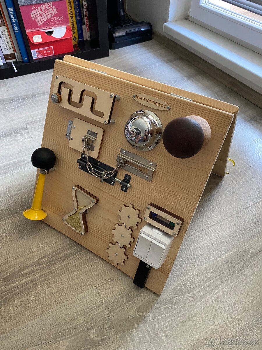 Prodám activity board typ střecha. Používaný jedním dítětem. Krásný stav. Vyrobený na zakázku. Originál od české značky Activity board – viz logo na desce. Spousta interaktivních prvků pro malé ručičky na rozvoj jemné motoriky. Světýlka svítí, ale doporučuji vyměnit baterie. Pouze osobní předání (Mladá Boleslav a okolí, Liberecko a okolí).