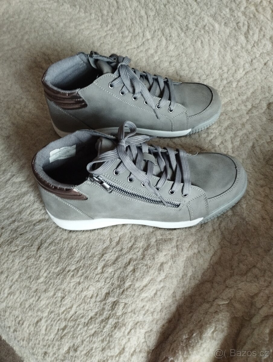 Prodám úplně nové, pouze vyzkoušené kotníčkové tenisky, světle šedé barvy,mírně zateplené, vhodné na jaro - podzim. Materiál umělá kůže, podrážka syntetika. Stélka je 26,5 cm. Značka Bonprix.Velikost 42, ale budou pohodlně sedět na velikost 41. Mám již doma ty samé, pouze jinou barvu a sedí akorát, bohužel tyto jsou o kousek kratší ( i když je stejná velikost) a tlačí na palec. To je důvod prodeje, jinak jsou moc pohodlné. PC 649,- prodávám za 500,-. Plus zásilkovna nebo osobní převzetí.