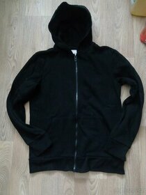 Černá mikina s kapucí, na zip, na bocích kapsy, nošená minimálně, v pěkném stavu. Vel. uvedena 164, délka 60cm, šířka pod průramky 46cm, rukáv od krku 67cm.