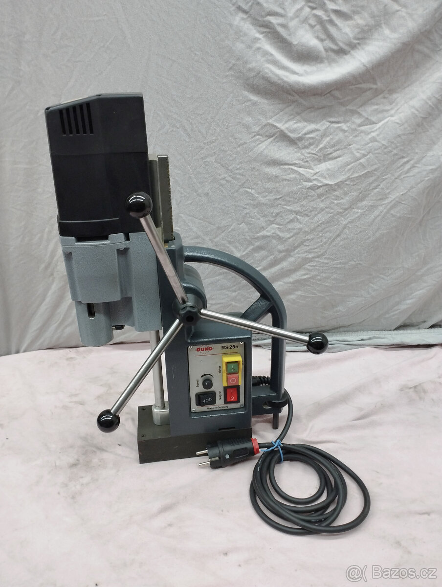 Nová značková kvalitní magnetická vrtačka RUKO RS25e. Made in Germany. Původní cena cca 63000,-Kč Velký výkon, univerzální morse kužel 2, převodovka se 2 otáčkami + regulace otáček a směru otáčení pro řezání závitů. Otočnou rukojeť je možné umístit na levou i pravou stranu. Masivní vodící lyžiny se stupnicí. Vysoký zdvih. V zadní části je nastavení pro zvýšení stability a přítlaku při vrtání. Vysoká upínací síla - možnost upnutí pomocí silného magnetu v jakékoliv poloze nebo kdekoliv na vrtaném materiálu. Velký výkon, lehce přenosná. Ideální i jako univerzální stolní vrtačka. Vřeteno má integrovaný vstup pro připojení hadičky od chladící kapaliny. Magnetické vrtačky RUKO: Výkon motoru patří k nejvýkonnějším pohonem v oblasti techniky korunkového vrtání. Vysoce kvalitní převodovka s kalenými přesnými ozubenými koly. Vysoká přesnost vrtání díky stabilní konstrukci a přesným vodicím plochám. Masivní rybinové vedení z plné mosazi, zaručuje přesnost vrtání. Přesný ozubnicové pohon umožňuje
