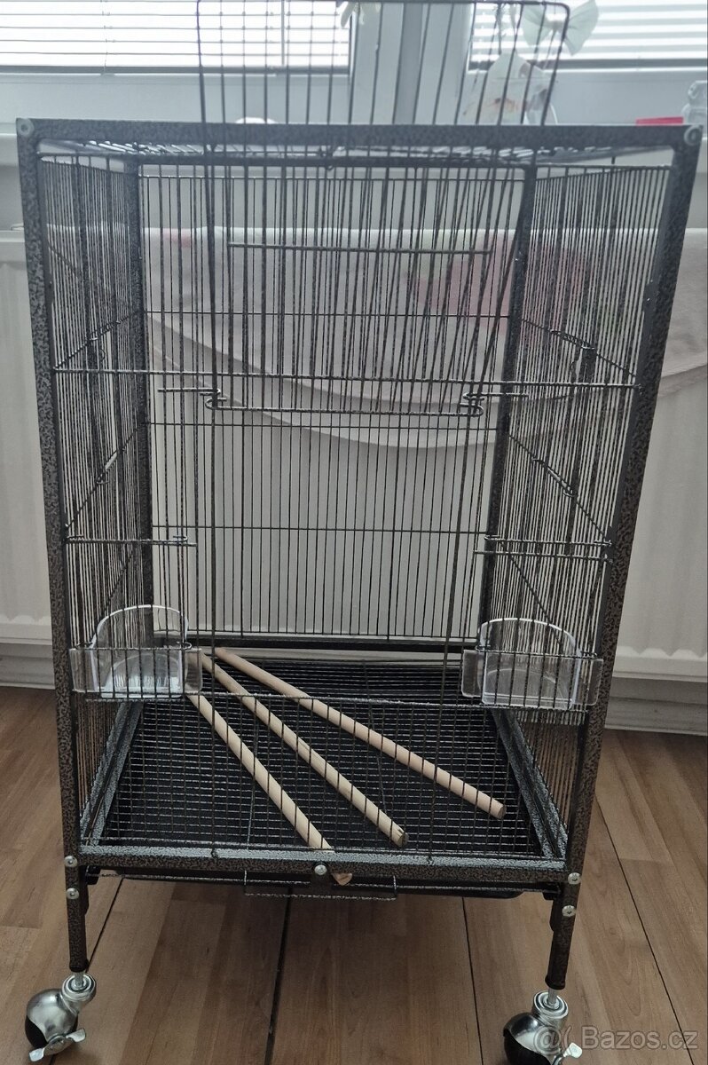 Klec je úplně nová i s visačkou. Rozměry 460 x 460 mm (18 x 18 palců) s roztečí mřížek 10 mm (0,4 palce), s odklopnou horní částí, s bidýlky, krmítky, plastovými miskami na krmení a kolečky. Prodáváme z důvodu špatného rozměru pro našeho papouška. Původní cena 1365Kč, nechám za 1200Kč.