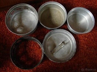 Nabízím vařící soupravu na táborový oheň, zvanou ešus, escajk, skladací s obalem. RETRO staré, do sbírky