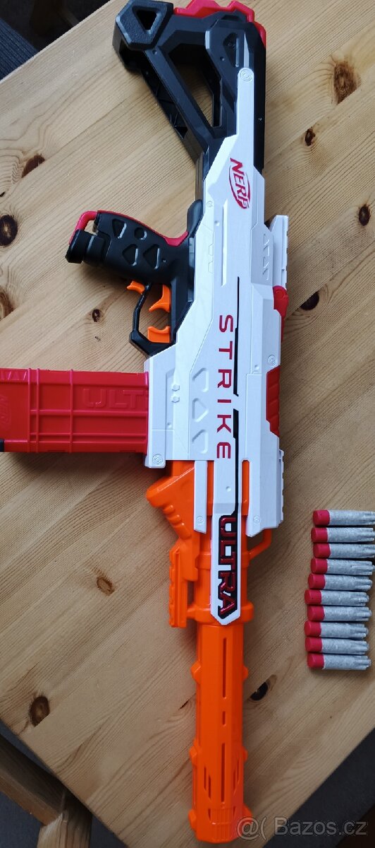 Prodám větší Nerfku strike ultra.Nerfka je čistá, nezničená, zachová,s deseti náboji.Na šest baterii.Funkční,více na fotkách.