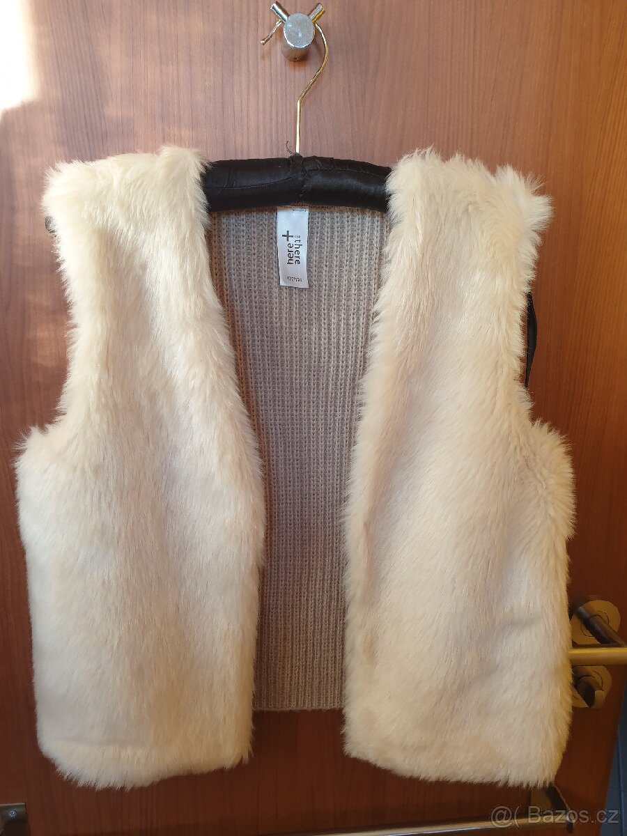béžová/krémová vesta, přední díl chlupatý - nepravá kožešina, zadní díl pletenina, moc hezká, bezvadná, málo nošená, téměř jako nová, zahřeje, zapínání možné jedním neviditelným knoflíkem, značka C&A, velikost 170/176