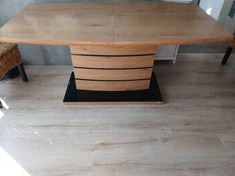 Prodám jidelni stůl.Moderní rozkládací jídelní stůl v elegantním a praktickém provedení. Podstavec je vyroben z kvalitní MDF v barvě dub v kombinaci s černým sklem, deska stolu je z MDF v barvě dub. Plocha stolu před rozložením je 80 x 140 cm, plocha stolu po rozložení je 80 x 180 cm. Šířka 180cm,výška 76cm,hloubka 80cm. Stůl je určen až pro 8 osob. Má lehké oděrky,jinak je v Top stavu.