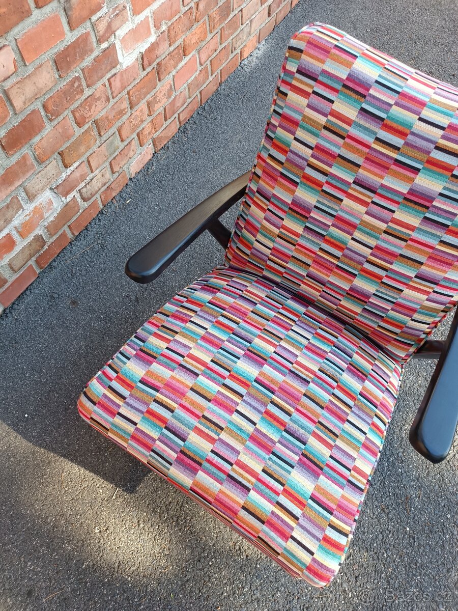 Nabízím k prodeji stylové, kompletně zrenovované křeslo, vyrobené v 60.letech. Renovace proběhla v následujícím pořadí: 1.Demontáž starého čalounění, původních potahů a výplní 2.Napnutí nových popruhů, přišití a vyvázání pružin 3.použití výplňových materiálů 4. Broušení dřevěných područek a noh, nalakování do černé barvy 5.Ušití, napínání a připevnění potahové látky s krásným barevným vzorem. 6. Upevnění područek a noh, přišití zad křesla Křeslo vynikne v jednoduchém interiéru, ale krásně zapadne i do hravého interiéru plného barev. Při rychlém jednání možná sleva. Preferuji osobní předání.