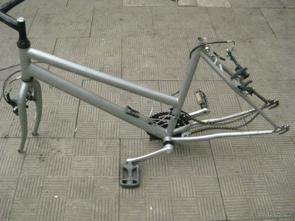Rám na dámské kolo + přední vidlice,středové uložení+převodník s klikou,pedálama,přední a zadní brzda,řidítka.(kostra je na kola 26").Druhý rám s vidlicí Favorit vel.58cm.tzv Salámy.Cena je za kus. Odběr Tovačov. Platí do smazání.