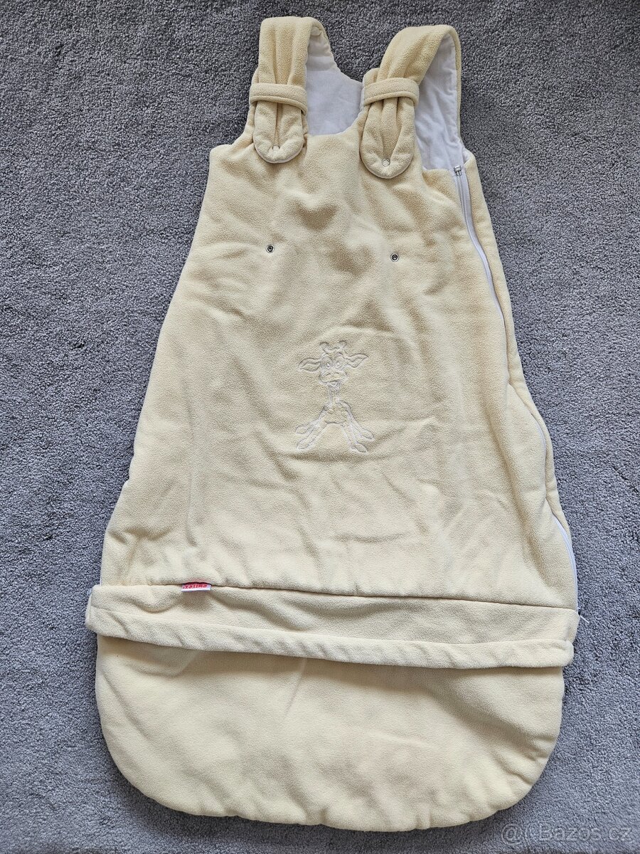 Nastavitelna delka pomoci odnimatelneho prodlouzeni, vhodny od narozeni do cca 2 let (do vysky 100 cm). Spaci pytel je zatepleny, ma prijemny material (vnejsi latka microfleece a uvnitr je bavlna), pytel lze rozepnout na tri casti, coz umoznuje vyprat jen dil ktery je uspineny. Otvory pro rucicky maji tri polohy zapinani na raminkach. Delka 90 cm, po odepnuti spodniho nanozniku je pytel zkracen na 65 cm (pro nejmensi miminka). Barva zluta s motivem zirafky.