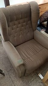 Šedobéžový ušák, šíře 78 cm, vyska sedáku 37cm, výška celková 101 cm. Na pravé područce mensi záplata. K vyzvednuti Senohraby o vikendu.