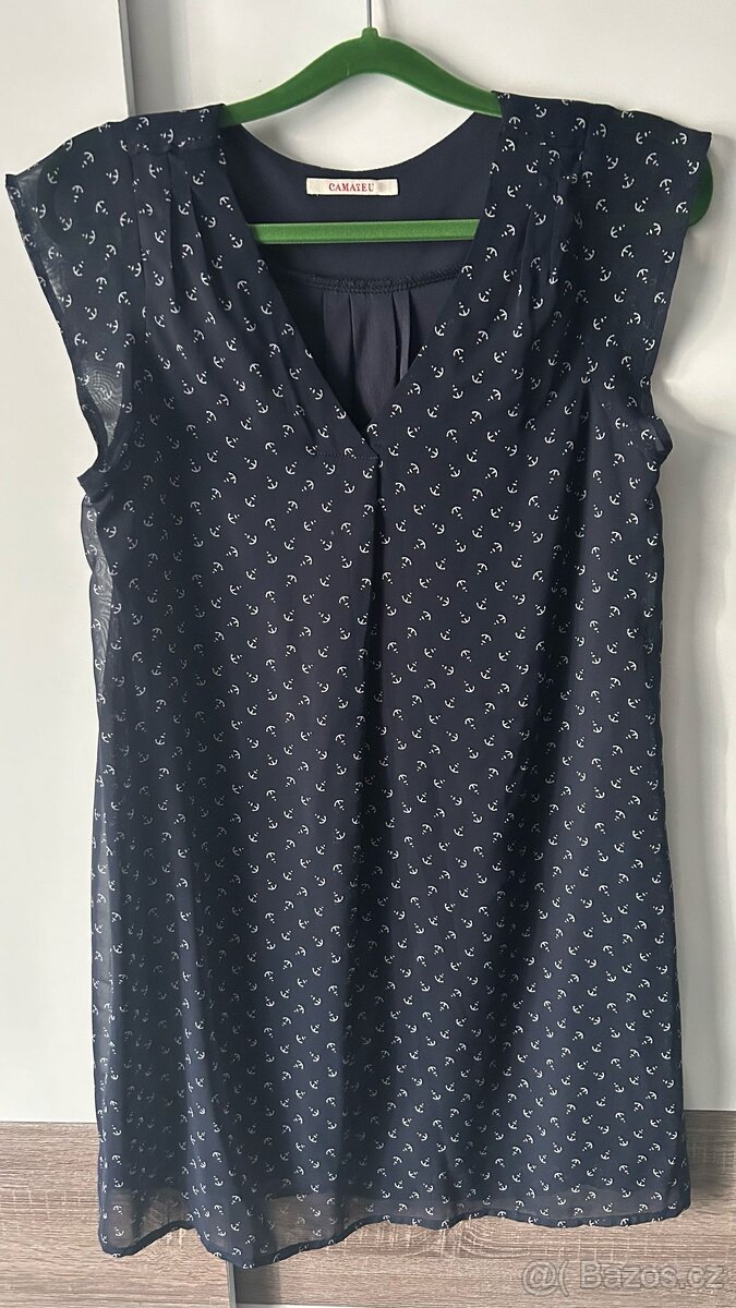Modré šaty s kotvičkami. Volný střih. Pružný příjemný materiál. Měla jsem na sobě 1x. Jinak nenošené. Délka do půli stehen. Velikost 36. Délka od ramen 87cm.