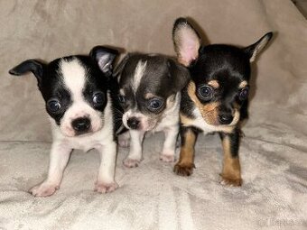 Nabízím k rezervaci krásné čivavky bez pp kluky. Máme černého, černo-bílého a modro-bílého. Jsou to hodná a aktivní štěňátka. Váhově budou mít do 2.300kg. Zvyklá na děti. Při odběru budou očkováný, několikrát odčervený a čipovaný. Pouze do výborných podmínek. Jsou to lásky. Už krásně baští granulky Eminent puppy. Dáváme kapsičky, kuřecí maso s rýži. K vidění máme jen maminku. Tatínka mohu poslat foto. K odběru od 8. Března. Do nového domova si odnesou startovací balíček. Kupní smlouva dle domluvy. Ráda bych i nadále zůstala s novými majiteli v kontaktu. Více info po tel: děkuji prosím jen volat.