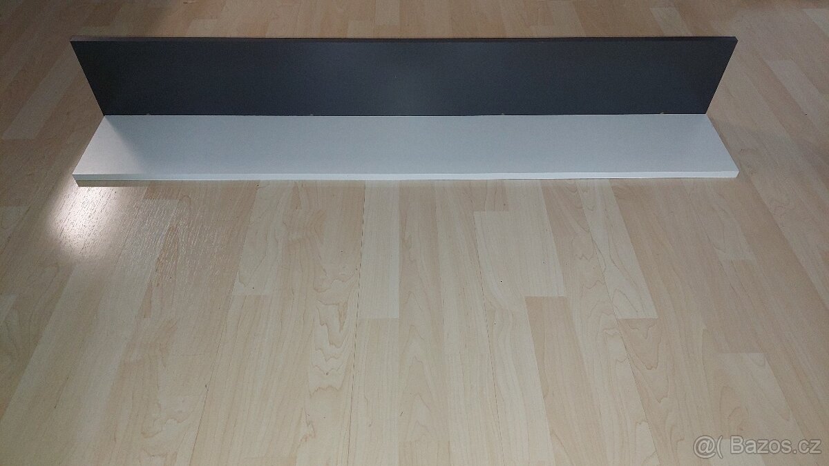 Police šedo-bílá, doporučená nosnost do 3 kg, zadní 2-bodové zavěšení na stěnu (vše součástí), rozměry: 120×18×19 cm. Nová nepoužitá.