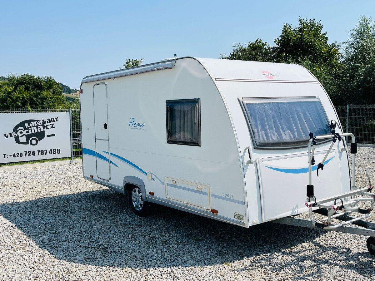 Bürstner Premio 400 TS - rok 2007 - hmotnosr 865/1000 kg, díky své váze je možno zapřáhnout i za menší automobil. - délka s ojí 615 cm - šířka 210 cm - rychlost 100 km/h - pro 2 dospělé a jedno malé dítě, pevná postel 145x195 a rozkládací sezení 90x155 cm - markýza s boky a předním čelem - el. bojler Truma - plynové topení Truma s rozfukem - lednice 12/230V/plyn - baterie zapojená do 12 V okruhu - sprchová vanička - nádrž na vodu - chemické WC Thetford - dvojitá okna s termoroletami a sítěmi proti hmyzu - stabilizátor - sklopný držák na 2 jízdní kola - - Heki okno - tří plotýnky na plyn - servisní dvířka - v ceně je zahrnuta dovozová STK - možnost montáže příslušenství (solárů, moverů, plyn. bojlerů a mnoho dalšího) - při prodeji odzkoušení a příprava v našem servisu v ceně - karavan je k vidění v Bransouzích u Třebíče, prohlídka možná kdykoliv. Před návštěvou si prosím zavolejte na tel.724 787 488 nebo 724 396 361. Všechny nabízené karavany máme skladem