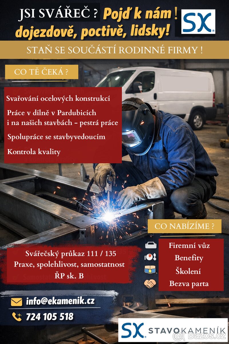 Cena: V textu. Jsme rodinná firma a právě teď mezi sebe hledáme svářeče, který má zkušenosti, zodpovědnost a chuť dělat práci, za kterou je vidět výsledek. Co u nás budeš dělat Svařovat konstrukce z černého materiálu – převážně elektrodou a svářecím automatem. Budeš převážně v naší dílně, ale budeš se pohybovat i po stavbách, montovat, zaměřovat. Vše v dojezdové vzdálenosti, nikam daleko se nejezdí – odpoledne jsi doma. Mít pod palcem vybavení, materiál. Spolupracovat s vedením na plánování a kontrole kvality. Co ti nabízíme Na práci vybavený firemní vůz. Stabilní práci v zavedené rodinné firmě, která si zakládá na férovém přístupu. Příspěvek na stravování , oblečení. Školení, možnost dalšího rozvoje. Firemní akce a partu lidí, se kterými se dá i zasmát. Co od tebe chceme Zkušenosti se svařováním ocelových konstrukcí (elektroda, automat). Svářečák, osvědčení pro metodu 111, 135. Řidičák sk. B. Samostatnost, pečlivost. Pokud chceš práci, kde je vidět výsledek, nespíš daleko od domova, ale odpole