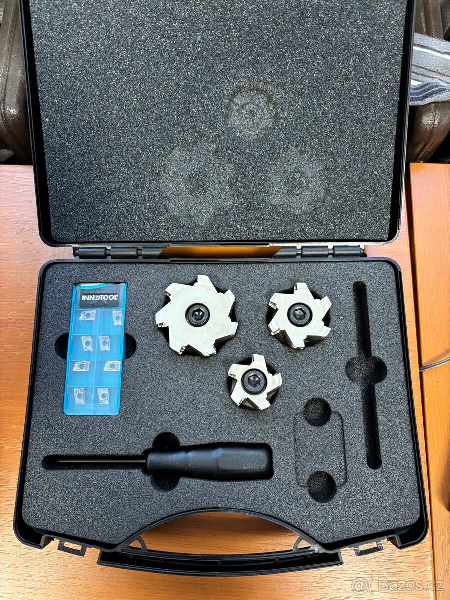 Prodam novou sadu INNOTOL. Frezovaci hlavy s vymenitelnymi britovymi destickami(VBD). 3 frezovaci hlavy. Montazni klic. Nahradni desticky. Cena 20000kc.