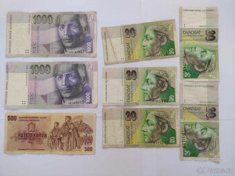 Obr. 1 - 1000 Sk (2000 Kč za kus), 20 Sk (150 Kč za kus), 500 Kčs (1250 Kč) Obr. 2 - Bulharsko (PREDANÉ), Španielsko (75 Kč), Kuba (75 Kč), Belgicko (75 Kč za 2 bankovky), Srbsko (60 Kč), Surinam (50 Kč), Irán (50 Kč), Peru (90 Kč) Obr. 3 - PREDANÉ Obr. 4 - 5000 Mark (100 Kč), 100 Mark (50 Kč), 20 000 Mark (50 Kč za 1 bankovku), 20 Mark (50 Kč), 10 Rubľov (125 Kč) Obr. 5 - sada núdzoviek (20 ks) za 200 Kč Obr. 6 - 2000 Lei (375 Kč), ostatné (PREDANÉ) Obr. 7 - Československo - 60 Kč za kus, ostatné PREDANÉ Tel. č. je vymyslené.