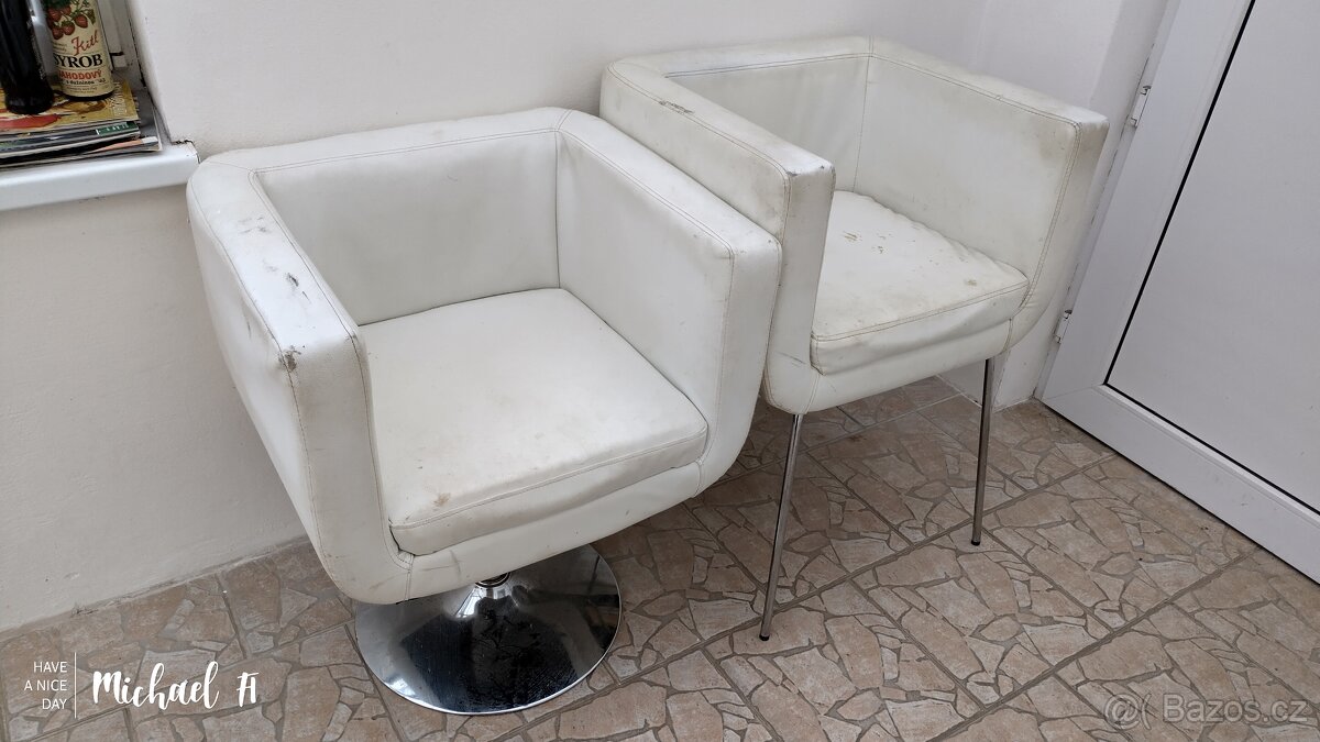 Kožené bílé křeslo 2 kusy. S otočnou podstavou dvě a jedno s nožičkami.