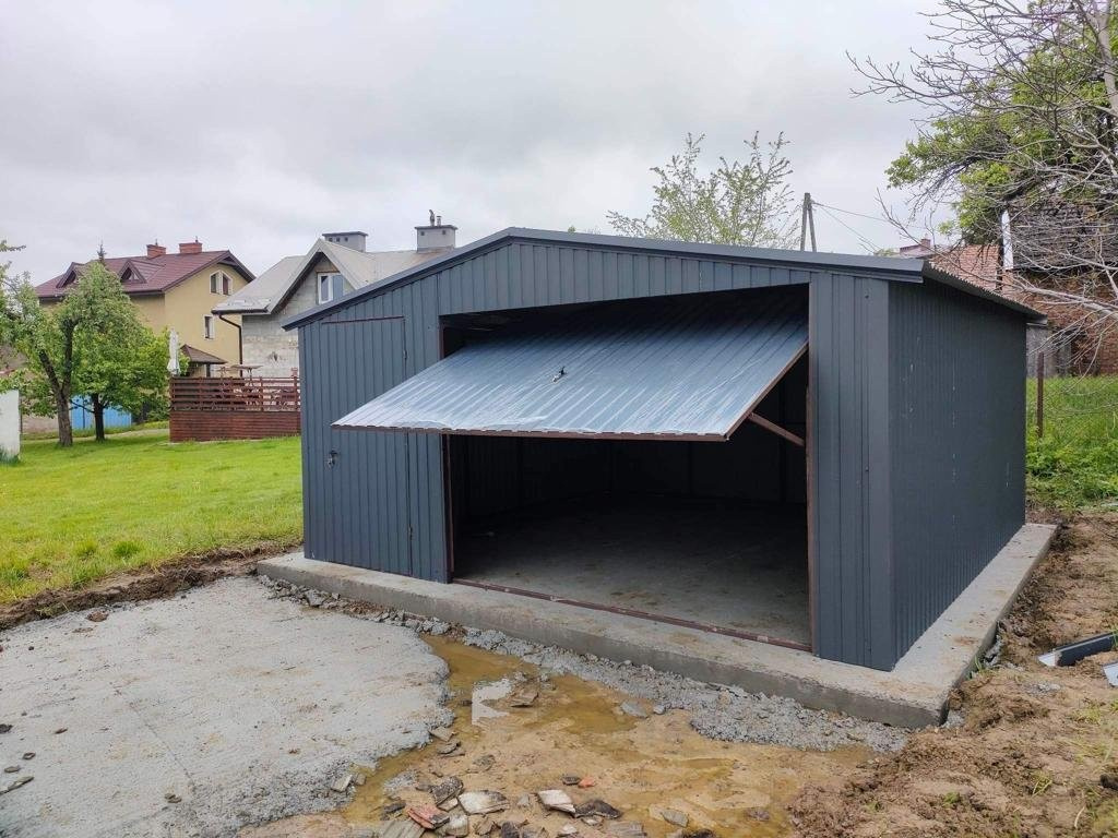 Šířka 5 m Délka 5 m Sedlová střecha Výška stěny 2,13 Výška k vrcholu 2,60 1 křídlová brána, 30 cm od pravého sloupku Výška vchodu 1,90/šířka 2,80 1 vrata velikosti 100 s klikou a zámkem, umístěná 30 cm od levého sloupku 1 výklopné okno na levé stěně, vystředěné, barva grafitová Barva RAL 7016 grafitová matná Svislý lichoběžník T7 Plechové lemování Konstrukce z pozinkovaných úhelníků a kanálků více informací a objednávky ///605516094 , [email protected]///