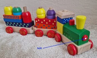 Prodám vláček ze dřeva, který rozvíjí jemnou motoriku dítěte. Vláček zároven svítí a vydává zvuk jedoucího vlaku. Prodávám více věcí, viz další inzeráty.