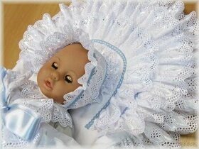 Luxusní souprava do kočárku pro miminko nebo reborn, realistickou panenku. Zavinovačka s vyndávací vložkou + čepička. Rozměry : 38x120 cm. Kolem hlavičky jsou 3 řady krajek. Vázání - křídla jsou po celém obvodu obšité krajkou. Zapínání na 2 knoflíky, stuha atlasová lesklá. Složení látek : povlak 100 % bavlna plátno. Krajka - 65% PES, 35% BA, výšivka-viskozové hedvábí. Výplň- vložka 100% bavlna plátno, 100% polyester protialergické duté vlákno 150gr. - 1,5 cm na výšku. Tato vložka je celoroční. Je možné ušít také vložku tenší 1 cm nebo silnější 2 cm. V případě zájmu připište na email, cena se nemění. Údržba: praní 40°C, po oprání co nejvíce vyrovnejte, usnadníte si tak žehlení. Není nutné kulmování, stačí lehce naškrobit a nažehlit volánky. Praní výplně: 40°C, ždímání při snížených otáčkách, žehlení na malý teplotní stupeň bez napařování, dbejte na to, abyste na výrobek příliš netlačili, mohlo by se poškodit duté vlákno-seškvařit. Materiály mají atesty nezávadnosti pro děti do 3let