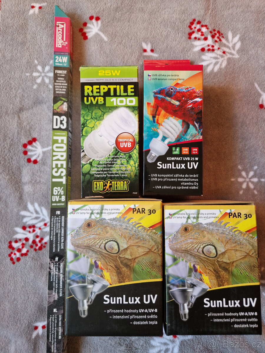 Nabízím na dosvit nebo na použití jako výhřevné žárovky použité UVB světla. Žárovky 50kč/ks, zářivka (55cm) a výbojky (35W) 100kč/ks. Vše použito po deklarovanou dobu 6-12 měsíců. Předání osobní nebo po platbě předem mohu zaslat přes Záslkovku (Balíkovnu) kontakr prosím přes mail, číslo je smyšlené