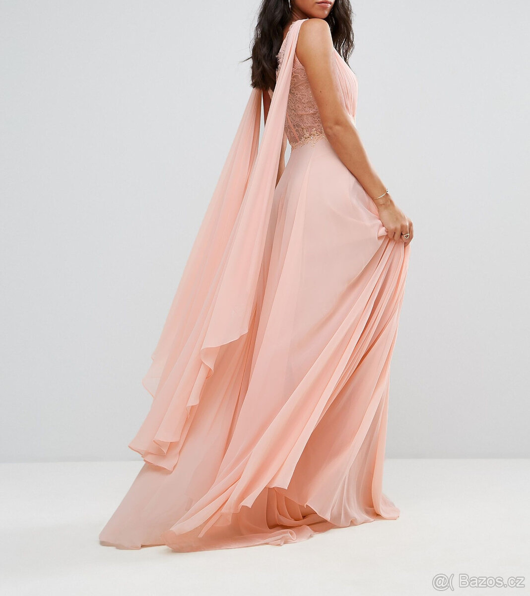 PC necelých 500, již nesehnatelné. Více možností nošení. Buď nechat látku zakrývat ruce jako plášť nebo lze vzadu uvázat na různé způsoby. Celoplošně podšité. Podprsenka netřeba, oblast dekoltu je vyztužená. Sukně je vzadu prodloužená do mírné vlečky. #luxusní #šaty #plesové #večerní #svatba #meruňkové #maturitní #společenské