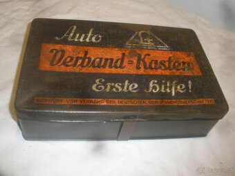 Stará válečná nebo předválečná autolekárna VERBAND KASTEN, ERSTE HILFE rozm.26X16.5X6.5cm,místy orezlá,stav viz. foto Osobní převzetí Mělnicko nebo posílám poštou