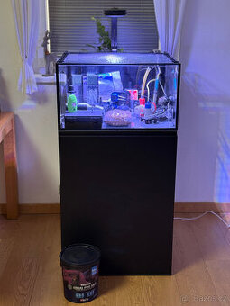 60x60x33cm (60x52x33cm bez filtrace) 8mm sklo Optiwhite · Filtrační košíky · Výtlačné čerpadlo Jebao MDC-2000 · Proudové čerpadlo Jebao OW-10 · Osvětlení AI Prime HD · Dávkovací čerpadla 2x H2Ocean P1 · Doplňování odparu Tunze osmolator nano · Topítko 75 W · Tunze držák hadiček na odpar a dávkovací čerpadla · Red Sea Krycí síť · Refraktometr Grotech · Tester na PO4 Hanna Checker · Reverzní Osmóza plus náhradní náplň DI · Reef-Roids 2/3 · Red Sea Coral Pro 7 kg ½ · ATI Essentials Pro 1/4 · Brightwell NeoNitro 3/4 · Stěrka Tunze Care Magnet Nano · Stěrka Mag-float · Malý zbytek písku · Velká pipeta, zásoba malých pipet, různé hadičky, síťka na ryby, odkalovač Pro inspiraci jsou v příspěvku fotky, jak bylo akvárium zařízeno.