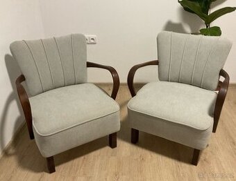 Prodám párová křesla H-237 ( koktejlky) Designer Jindřich Halabala, výrobce UP závody, období 30-40 léta. Po kompletní profesionální renovaci. Nové pružiny i kompletní výplň. Čalounění Tenatex, tkané mikrovlákno s vysokou odolností 140 tis.ot., barva světle šedá. Kostra i područky zpevněné, barva ořech, mat, zataženo voskem. Stůl Pavouk na foto NENÍ součastí prodávaných křesel. Cena za kus 24900,-Kč