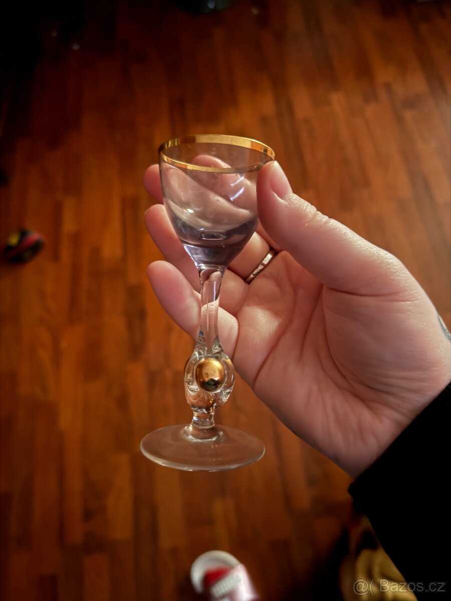 Jde o kordiální sklenici Josef Staník Zlatá Zuzana s ametystovým (fialovým) sklem a zlatým okrajem. Sklenice je ručně foukaná s charakteristickou zlatou kuličkou ve stonku. Design pochází z konce 50. let 20. století z Československa a získal několik ocenění. Mám 6 ks. Jeden kus za 300,-