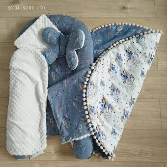 Hrací deka, hnízdečko, podložka do hnízdečka, 2x polštářek, deka. Oboustranné, z jedné strany béžová minky látka. Značka Jukki