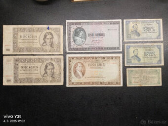 Prodám bankovky Československo 1945-46. Bankovka: 1000 kčs 1945 2x 1000 kčs 1945 (bez data) 500 kčs 1946 (serie A) 20 kčs 1945 (bez data) 2x 10 kčs 1945 (bez data) Cena za celek