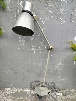 Prodám starou kovovou lampu s nastavitelnými dvěma klouby. Na plochu se přidělává příchytným šroubem. Vypínač na přívodním kabelu.Stříbrná.