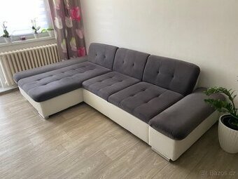 Prodám zánovní sedací soupravu levý roh. Bílá koženka + tmavě šedý semiš. Opěrné polštáře jsou přidělané na pevno. Úložný prostor a funkce každodenního spaní. Sedačka je pěkná a ve velmi dobrém stavu. Šířka 280 cm, hloubka rohové části 160 cm.