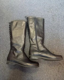Luxusní vysoké kozačky z jemné teletiny se zapínáním na zip pro úžasný módní dojem. Jemně sedí na patě, šířku holeně lze nastavit pomocí dlouhého šněrování. Přirozeně prostorná oblast prstů. Odolná hřejivá podšívka a lehká podrážka se vzduchovými polštářky a podpatkem.Prodám kozačky značky Dansko model Birgitta, jsou skoro nové, byli jednou obuté, velikost 41. Pořizovací cena 6090,- Kč
