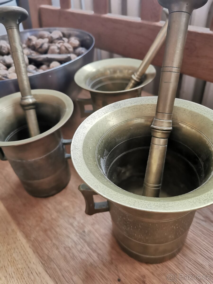 Prodávám 2 mosazné hmoždíře s paličkou, jsou 11,5 cm vysoké. Ten třetí, větší, je prodaný.