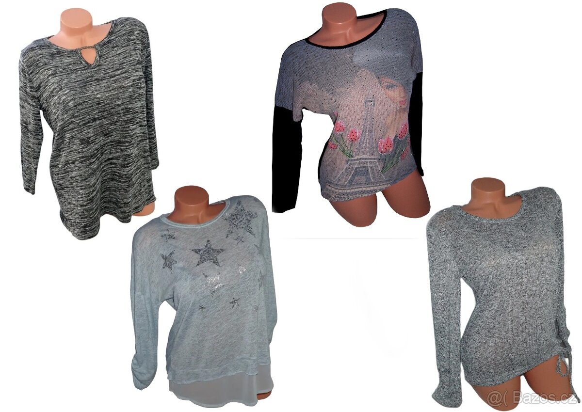 Cena: V textu. 1) úpletová halenka Takko vel.40 hezká úpletová halenka, šedá melanž, delší zadní díl. Bez vad. 90Kč 2) úpletová halenka vel.40 hezká dámská halenka s efektem 2v1. 90Kč 3) dámský svetřík vel.40 hezký moderní svetřík, teplejší tričko. 100Kč 4) dámská úpletová halenka vel.36/38 šedá úpletová halenka protkaná stříbrnou nitkou. 50Kč Balíčky zasílám ZÁSILKOVNOU, BALÍKOVNOU, PPL.