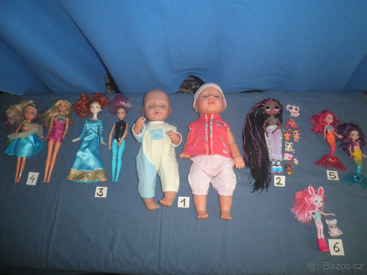 Cena: V textu. Číslo 1 - plně kloubová,Zapf Creation AG,v.42 cm,mluví,pláče,směje se + druhá panenka Peterkin zdarma -- 690 kč č. 2 - L.O.L Suprise,velká ségra v.27 cm -- 290 kč č. 3 - Mattel , 27 a 25 cm -- po 100 kč č. 4 - Sparkle s křídly 27 cm a Zuru 28 cm -- po 100 kč č. 5 - Mattel , mořské panny 19 cm -- po 100 kč č. 6 - Mattel , Enchantimals 18 cm a 5 cm -- 100 kč