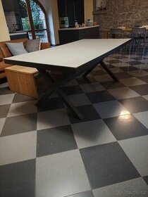 Deska z kaleného bezpečnostního skla s povrchovou úpravou v designu žuly, masivní hliníkové podnoží v antracitové barvě. Velice solidní konstrukce, u stolu může pohodlně stolovat 8 osob. Vyrobeno v Německu. Původní cena 600€, teď 5500Kč.