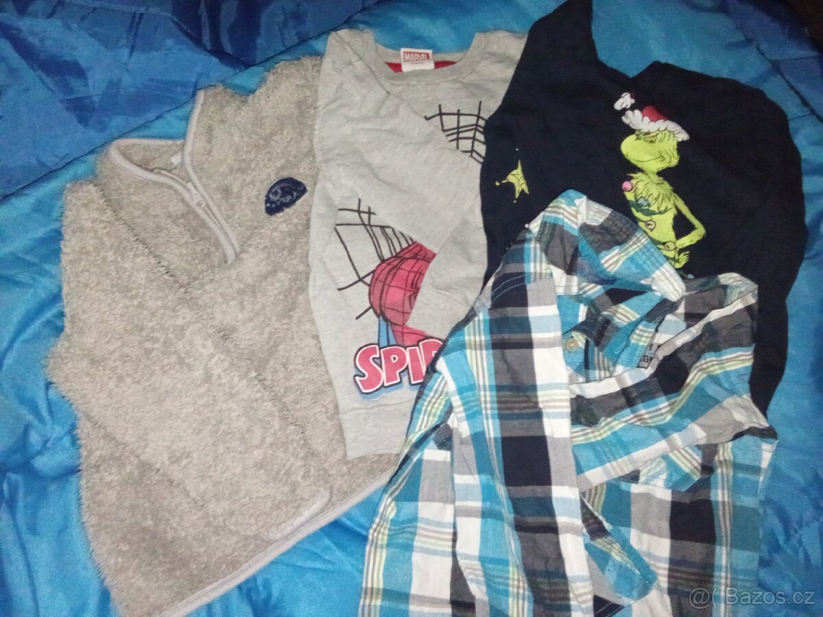 Dětské oblečení čtyři kusy jako celek chlupatá šedá mikina dlouhý rukáv vel.98/104 šedá mikina dlouhý rukáv Spiderman vel. 104 modré tričko dlouhý rukáv Grinch vel. 110 košile dlouhý rukáv vel. 116/122