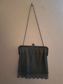 Prodám starožitnou kabelku z kovových drátků, nahoře v otevírání zasazeny 2 modré kamínky, vepředu chybí malá kulička, vzadu pár malých prasklin, lze je jednoduše opravit, velikost 17 X 17cm, délka řetízku 44cm