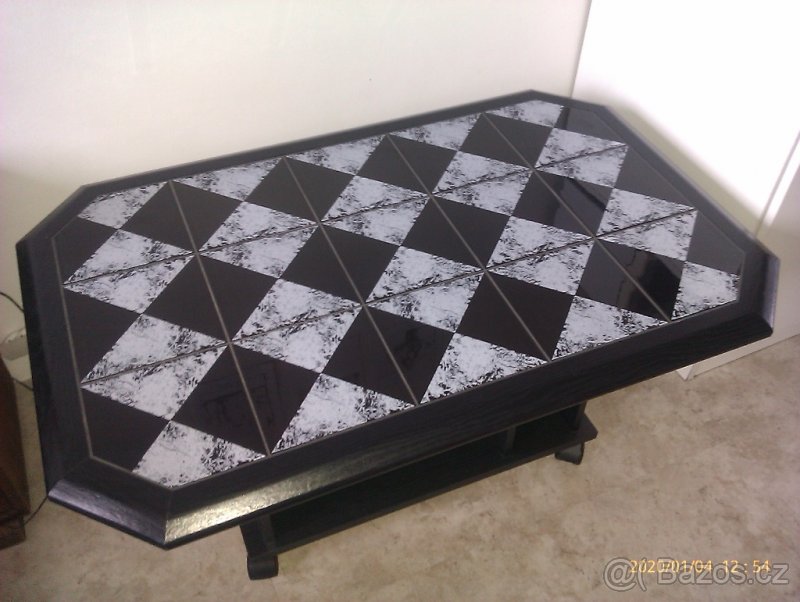 Konferenční stolek na kolečkách černobílý, kombinace dřevo a keramické dlaždičky, velikost horní desky 113 x 72,5 cm, výška 53 cm. K vyzvednutí na Černém Mostě v Praze.