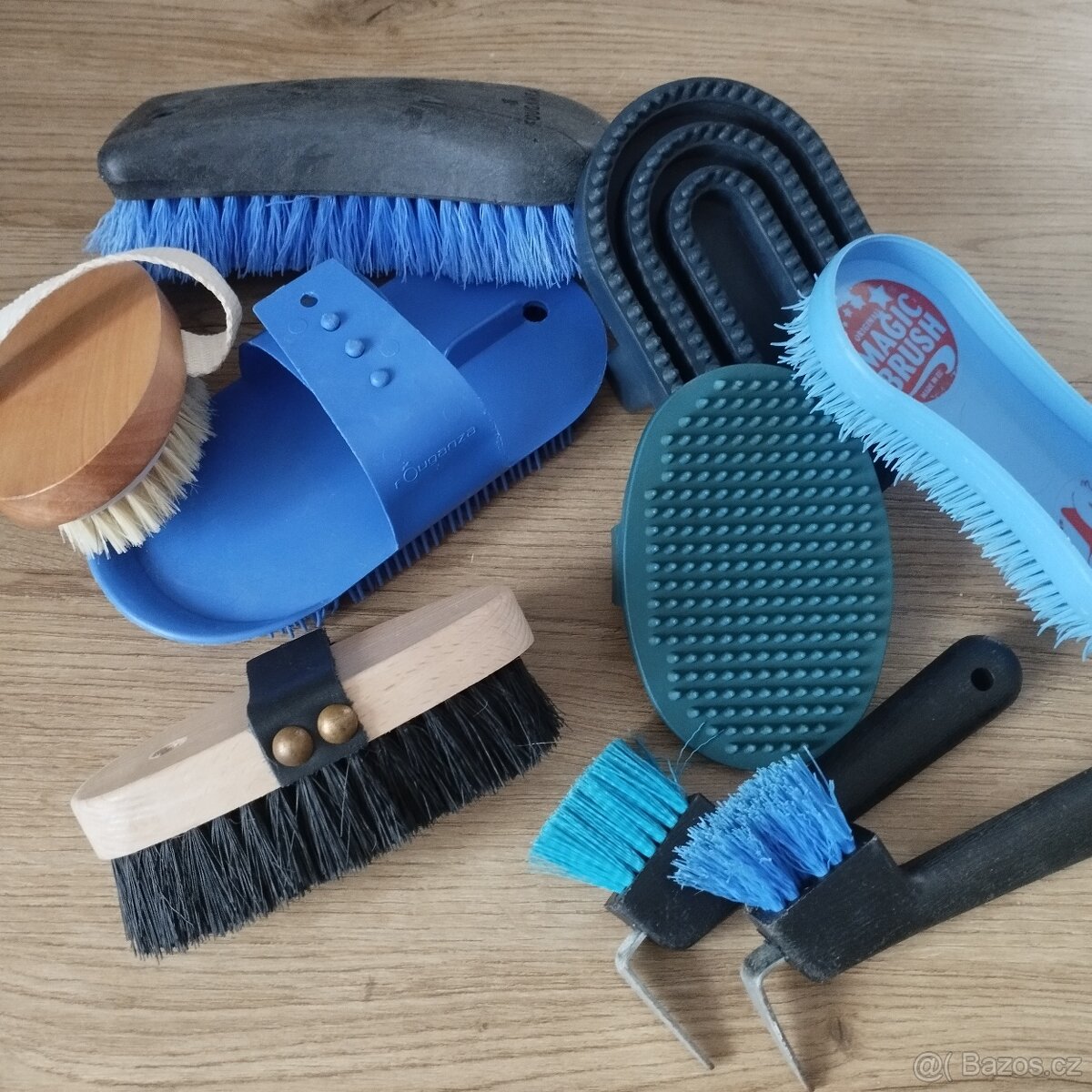 Prodám sadu modrého čištění na koně.1x gumové masážní hřbilko, 1x gumové flexi hřbilko, 1x plastové hřbilko, 1x kartáč Magic brush, 1x měkký kartáč, 1x tvrdý kartáč, 1xtvrdy kartáč delší vlas, 2x kopytní háček s kartáčem.