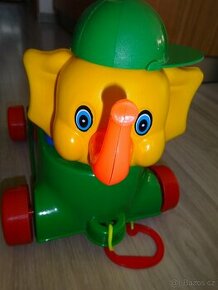 Sloník je na provázek, kterému se při jízdě hýbe hlavička z jedné strany na druhou. Hlavička je rozebírací - nos, čepice i celá hlava lze vyndat. V tělíčku jsou barevné kostičky, které se prostrkávají víčkem. Moc pěkný stav.