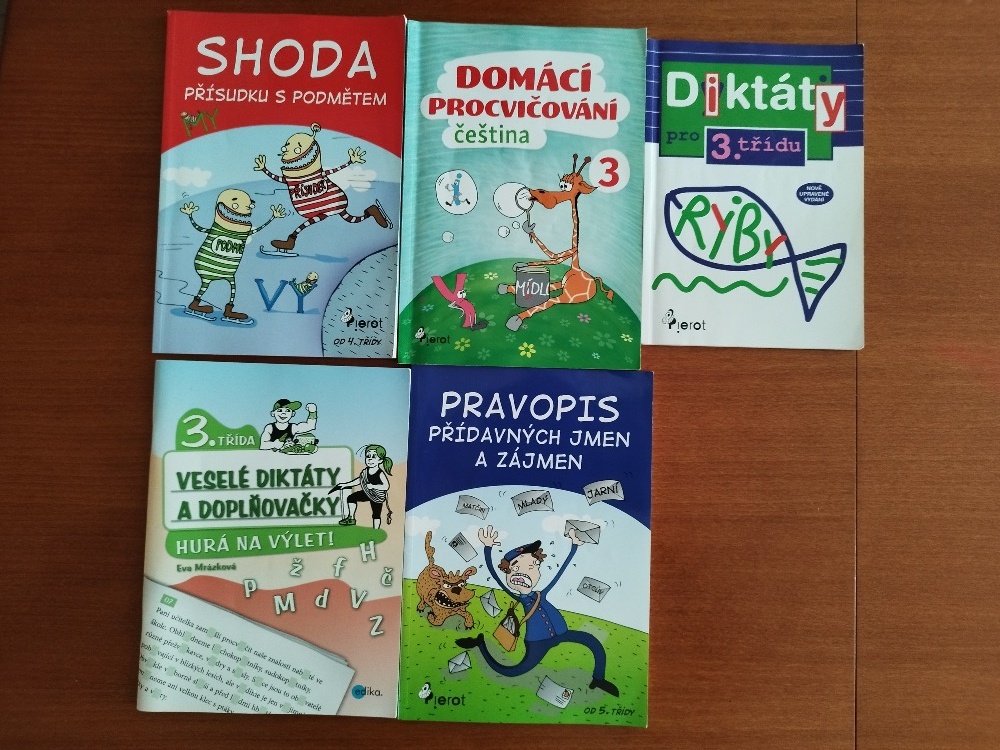 Prodám knihy na procvičení češtiny. Shoda přísudku s podmětem, domácí procvičování, diktáty pro 3. třídu, veselé diktáty a doplňovačky pro 3. třídu, pravopis přídavných jmen a zájmen. Cena 100 Kč (za všechny).